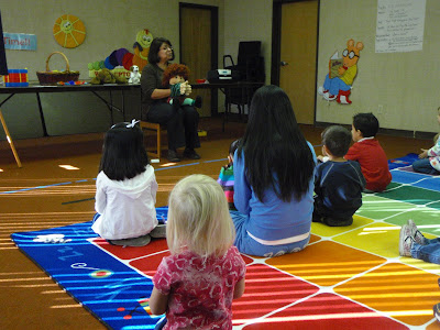 Miss Sandi telling a story with Molly the puppet!