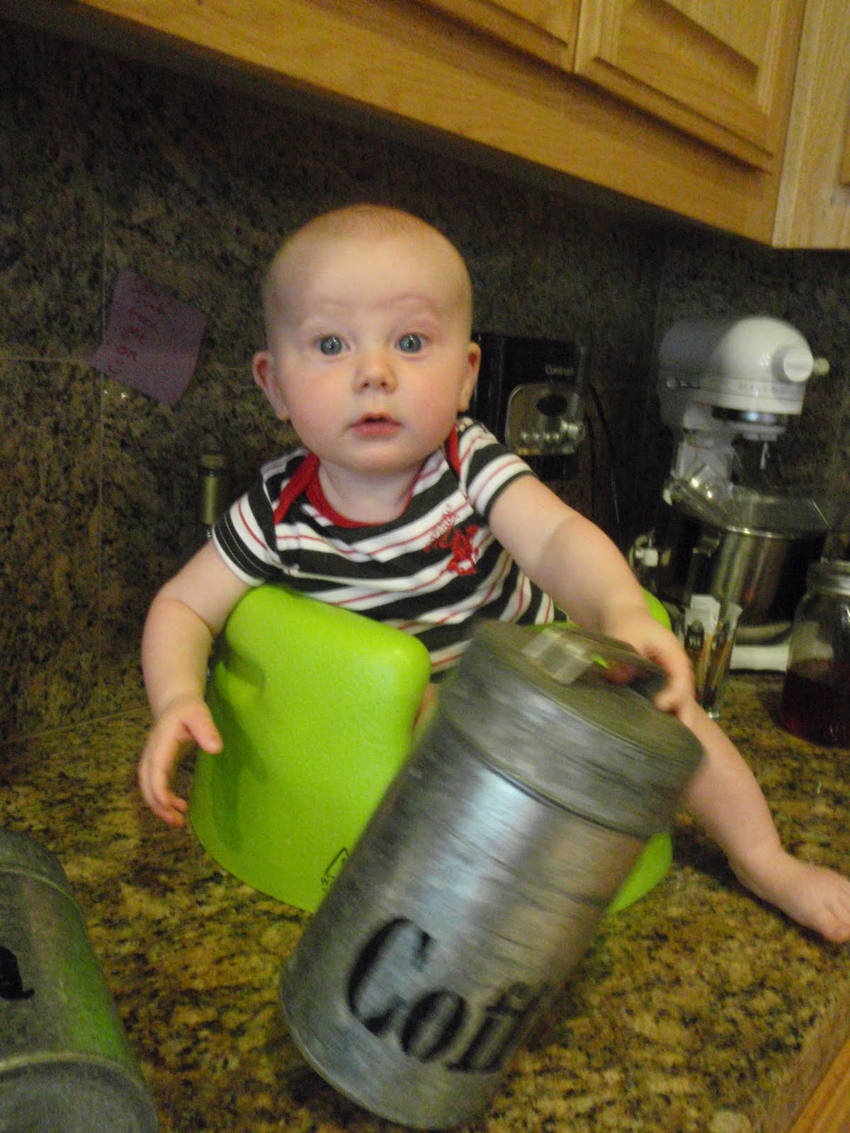 While cook'n up some Macaroni and Cheese, James got curious about his surroundings... don't worry, grandmas, the knives were well out of reach :) However, the wooden spoons were another story! He had all of them out and on the counter and floor in no time!